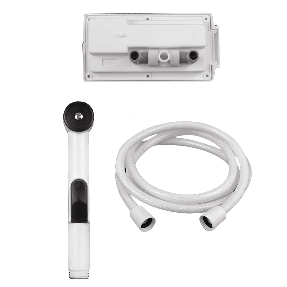 Install flush in the transom or under the gunwale. Includes hinged cover and replaceable sprayer head. Fixtures are corrosion-resistant. Housing and cover are made of high-impact, UV resistant, engineering-grade plastic and are pre-drilled for six #8 fasteners. Comes with 6′ hose, shut-off and hot/cold mixing controls. Connects to freshwater system for showering