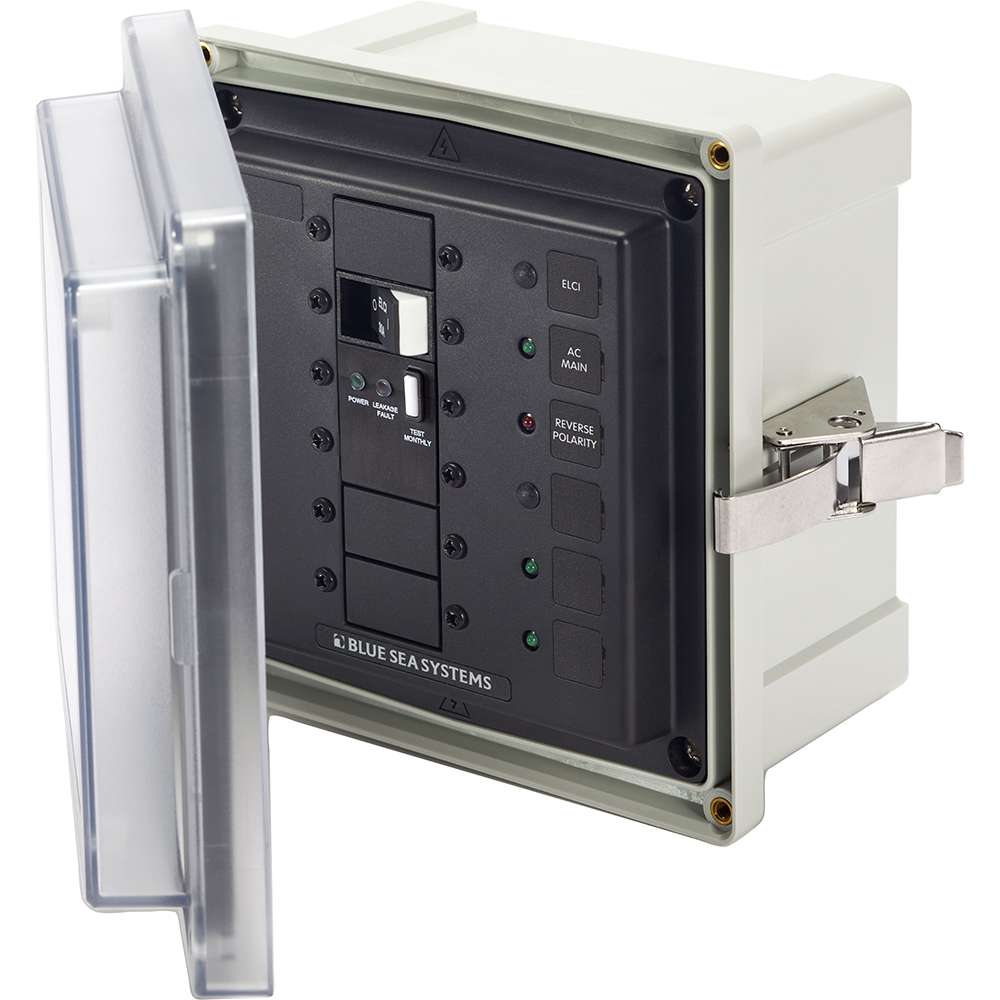 The 3118 panel enclosure is built for Equipment Leakage Circuit Interrupters (ELCI) main circuit breakers and other large frame devices. Meets ABYC E-11 when used with an ELCI Main circuit breaker and mounted within 10′ of AC shore power inlet.