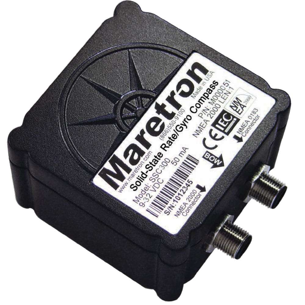 Maretron’s SSC300, implementing the second generation of Maretron’s award-wining compass technology, is a solid state, rate gyro electronic compass that provides better than 0.7x heading accuracy through q45x of roll and pitch angle, and better than 1x roll and pitch accuracy in static conditions. Each SSC300 is factory calibrated for maximum accuracy. It delivers precise, reliable heading information ten times per second, plus vessel attitude including pitch and roll readings once per second. A micromachined 3-axis rate gyro is used, in conjunction with a 3-axis accelerometer, by advanced stabilization algorithms to provide accurate, stable readings during dynamically changing conditions such as hard turns or rough seas, making it an ideal heading sensor for autopilot or radar overlay applications.