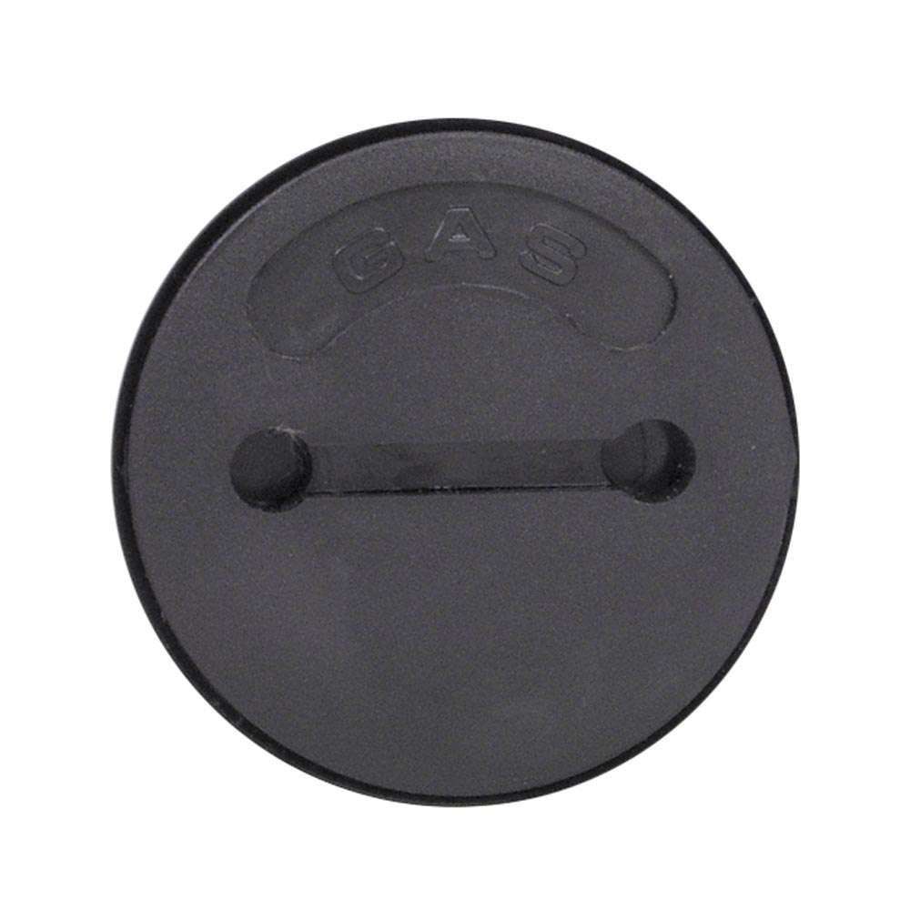 Black polymer gas cap has a slot between the holes.
