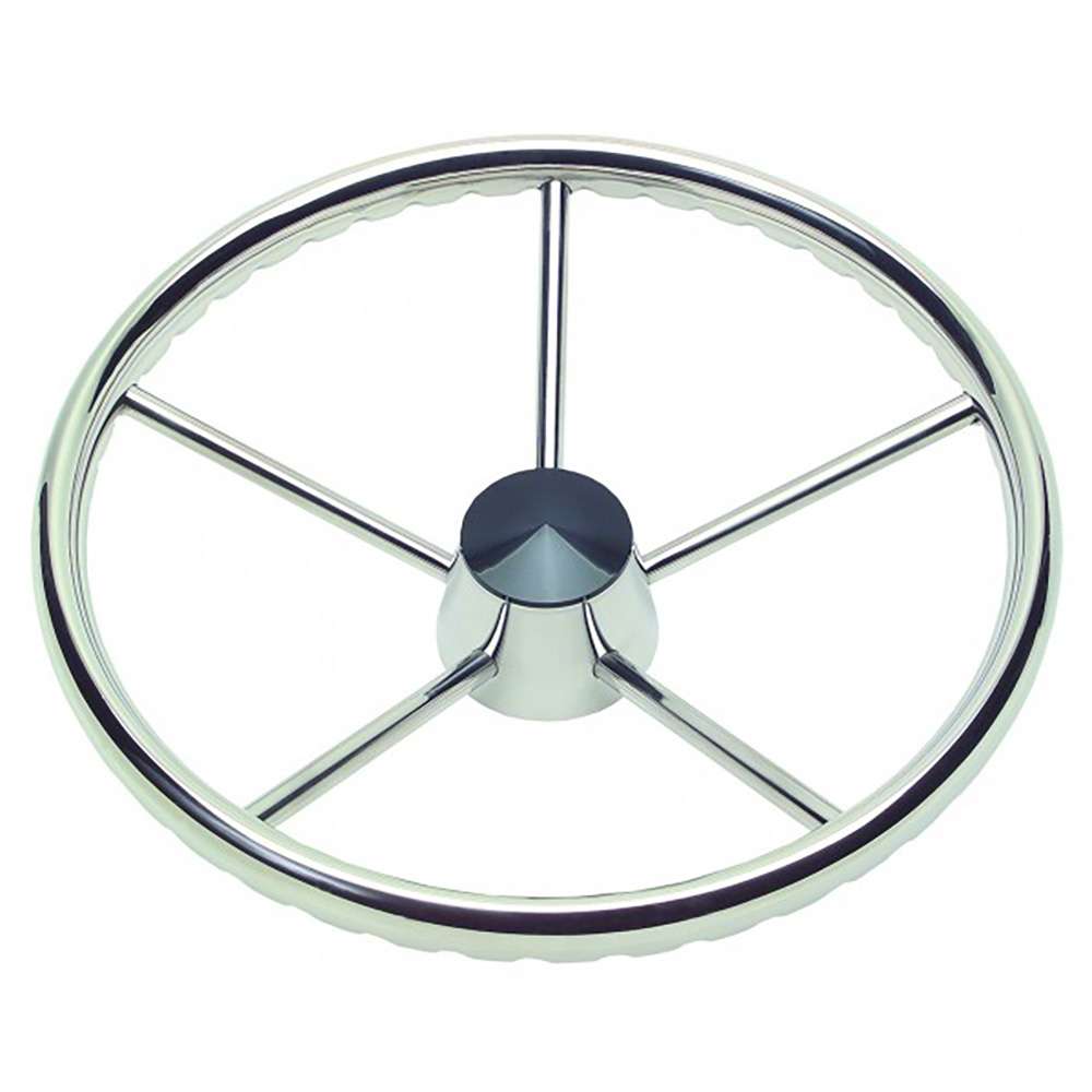 The Destroyer Wheel is a 5-spoke stainless steel steering wheel that can be a great addition to any boat. This specific steering wheel comes with a fitted black center cap.